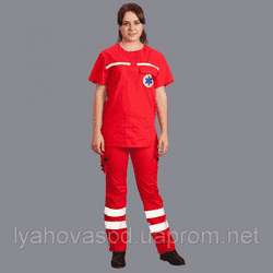 Брюки с центральной застежкой на тесьму-«молния». По бокам в пояс брюк вшита резинка. Брюки с двумя объемными накладными карманами с клапаном по бокам и двумя задними накладными карманами. По низу брюк находятся две светоотражающие полосы.